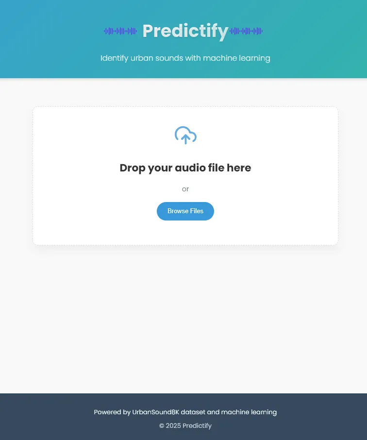 Trained the classifier on UrbanSound8K features, exposed predictions through Flask, then connected it to a React frontend through a Node.js proxy.